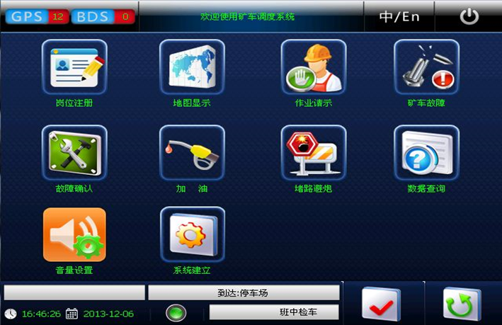 車載終端是安裝在挖機、鉸卡、鉆機及其它輔助車輛等設(shè)備上的專用計算機。由中央微處理機、觸摸屏、顯示屏、衛(wèi)星定位系統(tǒng)、接口系統(tǒng)和電源系統(tǒng)組成。各部分與主體之間采用高強度電纜、航空插件聯(lián)接。車鏟通用的智能終端適應(yīng)工業(yè)現(xiàn)場能力強,對過壓、過流、過熱、欠壓具有自保護(hù)功能,還具有防水、防塵、防過熱、抗震等功能。智能終端能夠收發(fā)指令信息,并實時的將現(xiàn)場的生產(chǎn)情況和設(shè)備狀況傳遞到總控系統(tǒng)。智能終端系統(tǒng)采用觸摸屏控制,界面清晰明了,操作簡單。